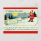 This postcard features a vintage illustration of a child pulling a scroll of resolutions with a New Year's greeting above and a message below.