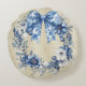 Elegant sophisticated vintage style blue white and ecru Christmas holiday pillow.