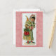 This beautiful custom vintage postcard displays a Christmas angel disguised as a young girl who is standing in the snow with her coat on, and pink ribbon on her hood while keeping her hands warm, and holding her little red purse. This adorable vintage image is set against a pink ornamental Christmas background, and makes a lovely postcard.
