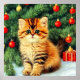 Poster featuring a vintage Christmas cat! An orange kitty with black stripes sits in the snow. Behind the cat is a Christmas tree with red and yellow ornaments. Also on the snow is a red present. A perfect gift for the Christmas season and cat lovers!