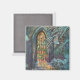 Vintage illustration Christmas holiday religious design featuring an architectural element, a stained glass window snowscape. A beautiful chapel with light coming through on the new fallen snow outside in the winter season landscape.