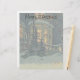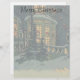 Vintage illustration Merry Christmas holiday design featuring an architectural snowscape in winter. The front of a snow covered house with Christmas wreaths in the windows.