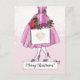 Pretty hand drawn fashion illustration of a walking woman with a bag full of packages. The bag shows a golden heart. The words "Merry Christmas!" are written in a trendy calligraphy beyond.