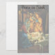 Vintage illustration religious Christmas holiday design featuring a classic nativity. A Christian religion family scene with Mary, Joseph and the infant Jesus Christ in the manger with lamb and sheep. Bethlehem.