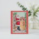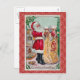 This cute custom vintage postcard features Santa Clause holding his bag full of toys. Behind Santa is a shelf that displays a toy drum, toy oven, toy boat, and teddy bear, a musical horn is lying on the floor next to Santa's boots. The words "Christmas Greetings" are displayed at the bottom of the card. The vintage image is set against a snowy red Christmas background to complete this lovely postcard.