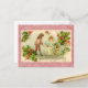 This adorable custom postcard features a young girl sitting on the couch fanning herself, as a young lad stands in front of her extending his hand. Bits of the holly and ivy border this vintage image and the words "Best Wishes for Christmas" are displayed at the bottom. This vintage image is set against an elegant pink ornamental Christmas background to complete this lovely postcard.