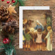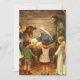 Vintage illustration religious Christmas holiday image featuring a beautiful classic nativity family scene with Mary, Joseph and the infant Jesus Christ in the manger in Bethlehem. A Christian religion scene with children gathered holding hands around the baby boy child.
