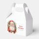 A tiny favour box with a cute vintage style watercolor image. Santa Claus in his red suit with jolly cheeks and a smiling face. Surrounded by pine and holly.