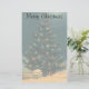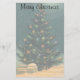 Vintage illustration Victorian Merry Christmas holiday design featuring a snowy landscape. A snowscape with a Christmas tree decorated with bright lights on a winter night with a starry night sky and snow on the ground. Happy Holidays and Season's Greetings!