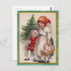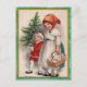 Share holiday cheer with this vintage Christmas postcard featuring two children dressed in old-fashioned winter clothes. One carries a basket of wrapped gifts, while the other holds a small Christmas tree. Set against a warm beige background with a classic green and gold border, this timeless design brings back the magic of traditional Christmas celebrations.