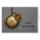 This unique Vintage Clock Table Number Card in light grey features antique steampunk clocks and gears hanging by a metal bead chain. The background has a textured paper and mesh overlay which adds a distressed and grungy feel to the design. This quirky and offbeat wedding table number card would be perfect for a steampunk inspired wedding. Easy to customize, simply add the appropriate table number(s) in the space provided. Click on the "Customize It" button to find additional personalization options.