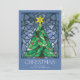 These bright and colourful 5" x 7" flat Christmas greeting cards feature a handmade watercolor stained glass window design of a green Christmas tree with a gold star and red ornaments framed in shades of blue on a dusty blue background. The greeting is "Christmas," in large decorative letters with an editable greeting, "Wishing you peace, love and joy this holiday season."