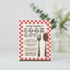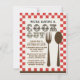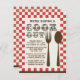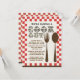This rustic, western style BBQ invitation can be used for your next southern style BBQ, or any type of backyard cookout. Gather up your friends and neighbours and have fun. Background features a chequered pattern in white and red as a classic tablecloth, written "We're having a cookout" in fancy vintage style fonts. Illustrated by a fork and a spoon.