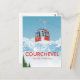 This crisp Vintage Courchevel Travel Poster Postcard captures the exhilarating atmosphere of the famous French Alps ski resort, featuring a bright red Gondola rising over snow-capped mountains.