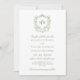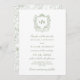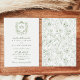 This timeless and elegant vintage style wedding invitation promises to charm and intrigue your guests with its botanical elegance and classic design. The front of the invitation card is graced with a delicate, wreath-like crest framing the couple's initials, set against a crisp white background. It evokes the beauty of an enchanted garden with its intricate greenery and floral detailing. Below the monogram, the details of the wedding are laid out in elegant, classic typefaces. The back features a botanical pattern in a soothing sage green that complements the invitation. This is not just an invitation but a cherished keepsake and a prelude to the elegance and romance that will define your wedding. From the green design to the regency style crest, each element is a nod to the couple's impeccable taste and the unforgettable experience they wish to share.