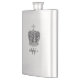 Elegant stainless steel flask, with a vintage illustration of an ornate crown. Personalize the grey one letter monogram and name, to suit your needs. Great personalized gift idea.