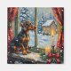 A nostalgic vintage Christmas scene featuring a Dachshund watching the snowfall from a warm candlelit window. The soft colors and classic details make it a perfect holiday keepsake.