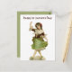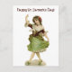 This postcard features a vintage drawing of an Irish maid. She’s wearing a green dress and matching shoes, with a brown laced up bodice. She’s dancing merrily with her hand in the air, and the other hand on her skirt …perhaps she’s doing a jig!