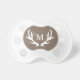 Vintage deer antler baby pacifier with monogram. Monogrammed soother with rustic animal horns. Country chic design with name initial letters of child. Cute baby shower gift idea. Customizable background colour. Brown and white. outdoor hunter / hunting theme for little boys and girls. Wild paci / Dummie / binkie with elegant typography. Cute gift idea for 1st birthday, new baby, new mom, pregnancy etc.