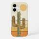 Retro illustration of a stylized cactus accompanied by a circular sun in a sandy palette.