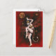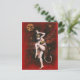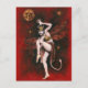 This postcard is illustrated with a vintage devil lady set before a red background with a Gothic skull moon and stars.