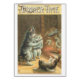 A vintage illustration depicts a parent cat (mother or father) sitting on a stool in front of a hearth with a long-handled iron skillet extended over the hearth's fire. Something good is cooking! Two kittens are eager to eat dinner. One stands nearby with a plate ready. The other got too close to the heat of the fire, and has fallen backwards in a tumble. The words "Dinner Time" are at the top of the front of the card. This card is blank inside for your own message.