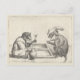 Vintage drawing of two monkeys playing what appears to be a backgammon game. One wears a hat and the other wears a jacket and is raising a drink.