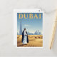 Experience the dazzling contrast of desert and metropolis with this striking vintage-style travel poster postcard for Dubai, UAE. The design captures a commanding view of the golden sand dunes where a caravan of camels treks, set against the futuristic skyline dominated by the magnificent Burj Khalifa. A figure in traditional Emirati attire (Kandura) stands proudly in the foreground, bridging the city's rich heritage with its modern ambition. The clear blue sky and warm desert tones create a luxurious, dramatic feel. This is a perfect postcard for fans of Middle Eastern travel, collectors of retro desert art, or those celebrating the innovation of the UAE.