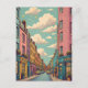 A vibrant and colourful illustration of a charming street in Dublin, Ireland. The buildings are painted in various pastel hues, creating a cheerful and inviting atmosphere. The sky is filled with fluffy clouds and twinkling stars, adding a touch of magic. The street is lined with cobblestones and features vintage cars parked along the side. The overall scene is peaceful and idyllic, capturing the essence of this beautiful European city.
