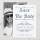 Vintage elements and dusty blue typography wedding Save the Date announcement. This elegant wedding design displays the text "Save the date" in bold dusty blue typography and vintage elements that form frames for the text. The back features a photo of the couple.