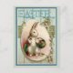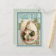 This postcard features a vintage Easter bunny with a basket of vegetables and an umbrella. It's set against a pale green barn board background and surrounded by white flowers.