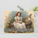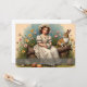 A young girl in an elegant vintage dress sits on a wooden log, holding a beautifully decorated Easter egg. Surrounded by blooming flowers and a curious rabbit, the scene exudes warmth, nostalgia, and the spirit of Easter.