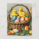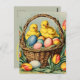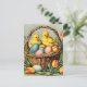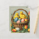 Cute old-fashioned Easter chicks are sitting in an egg-filled basket with vibrant tulips all around. Personalize the other side of this postcard with the details of your party .