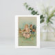 Adorable and whimsical vintage Easter illustration featuring little girl in pink frock with book in barn yard with hen, rooster, chick and Easter greeting with faux gold highlights on green background. Back features complementary optional hen graphic with editable text fields.