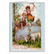 A vintage Easter card image depicts a woodland scene with two children playing and laughing on top of a large coloured Easter egg. A lamb grazes beside them with a floral wreath around its neck. The boy holds a basket of flowers while the girl raises a flowery branch into the air in her hand. The front of the card says "Easter Greetings" and the message inside is: "Happy Easter, Happy Spring, Happy, happy everything!"