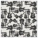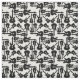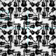 A black and white music themed fabric design with black electric guitar silhouette illustrations on a white background.