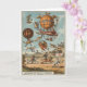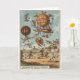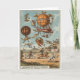 A vintage French illustration featuring a sky full of fantastic flying machines including hot air balloons, wings donned by humans, a flying sail boat and a large hot air balloon with sails, angel wings and a ship-like gondola. On the ground are two galloping horsemen and one man running with a flag and a flaming torch. The front of the card says in French "Les Utopies de la Navigation Aerienne au Siecle Dernier" translated to English as "The Utopias of Air Navigation in the Last Century." This card is blank inside for your own message.