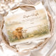 A charming countryside design featuring a fluffy calf, a sweet little lamb, and tiny yellow chicks nestled among soft meadow wildflowers. The warm parchment background and muted earth tones create a cozy, rustic atmosphere with a gentle storybook feel. Delicate greenery frames the layout while the farm animal illustration adds warmth and personality. Perfect for a neutral rural-themed celebration with classic farmhouse charm.