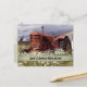 Tractor new address announcements. Moving to the country? This postcard features a well-used, rusted red tractor sitting in a field of wildflowers. A green strip hold text at the bottom on the front. Use first names, family name, or other wording to announce a move. On the back, customize text in two places. Include your new address, and use the "mail to" section to type in each individual address - or delete any text you don't want to use. The reverse also has a country image with a little house on a hill as the background.