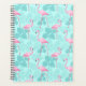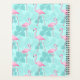 Retro tropical pink flamingo pattern of the beautiful tropical birds repeated with a light blue background and palm fronds.