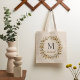Elegant beige floral wreath tote with custom monogram, perfect for bridesmaid gifts. Features vintage botanical design and wedding date
