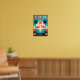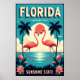 • Capture the vibrant charm of Florida with this retro-inspired travel poster. The design includes lush palm trees, a brilliant sun, and clear blue skies, creating a perfect representation of the Sunshine State's tropical allure.