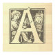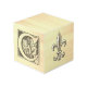 Illustrated vignettes from a vintage French alphabet design, letter A has child "artist", letter B has child with a "broom" and letter C has a child in a "chair" with a vintage French fleur de lis design on the remaining side of the block. Wooden pattern on wood cube. Perfect for the nursery.