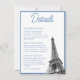 Share your event details in style with these vintage French Eiffel Tower Bat Mitzvah detail enclosure cards. The design features a blue toile floral design on the back with an Eiffel Tower photo and personalized text to share the details of your event on the front. Enter the Zazzle Design Tool to make additional adjustments.