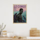 Beautifully illustrated antique aviation style travel poster featuring an African man amongst a jungle background. Colours include light purples, aqua blues and dark palm leaves.