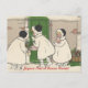 Vintage illustration by children's illustrator P. Ebner. Three girls, probably sisters, knock at a big green door, waiting with holiday gifts (even a little tree and a pig!) in hand. Text reads, "Joyeux Noel et Bonne Annee" which translates as "Merry Christmas and Happy New Year."