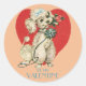 A cute French poodle with a blue bow in her hair and red rose in her mouth sits in front of a deep red heart. Her lease is on and she is ready for a walk or for you to be her Valentine. Vintage round Valentine sticker.