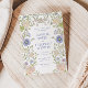 Featuring an exquisite hand-painted floral ornate frame, inspired by the intricate detailing of vintage engravings, the invitation showcases delicate blossoms and greenery, artfully arranged to create a captivating border that enhances the beauty of your wedding details. Embracing a harmonious palette of periwinkle, lilac, soft peach, and green, this invitation evokes a sense of romance and serenity, offering a fresh and inviting aesthetic. The elegant blue bell-colored font adds a touch of sophistication and grace to your announcement, and it can be easily changed to any color of your choice, allowing you to tailor the invitation to perfectly match your wedding theme and personal style.