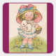 Cute, vintage picture of a girl wearing a big bonnet and holding a white bunny and a basket of chicks, is featured on this square Easter sticker. With message, "Joyous Easter", making this a great sticker for those special mailings, decorating, scrapbooking and more! This design is also available as a greeting card.