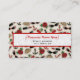 A fashion themed business card featuring a vintage glamour themed pattern. Design consists of cherries, a red rose, red and black cat eye sunglasses, a leopard print purse, red and black anchors, and red lipstick. Design has a red and black colour scheme.